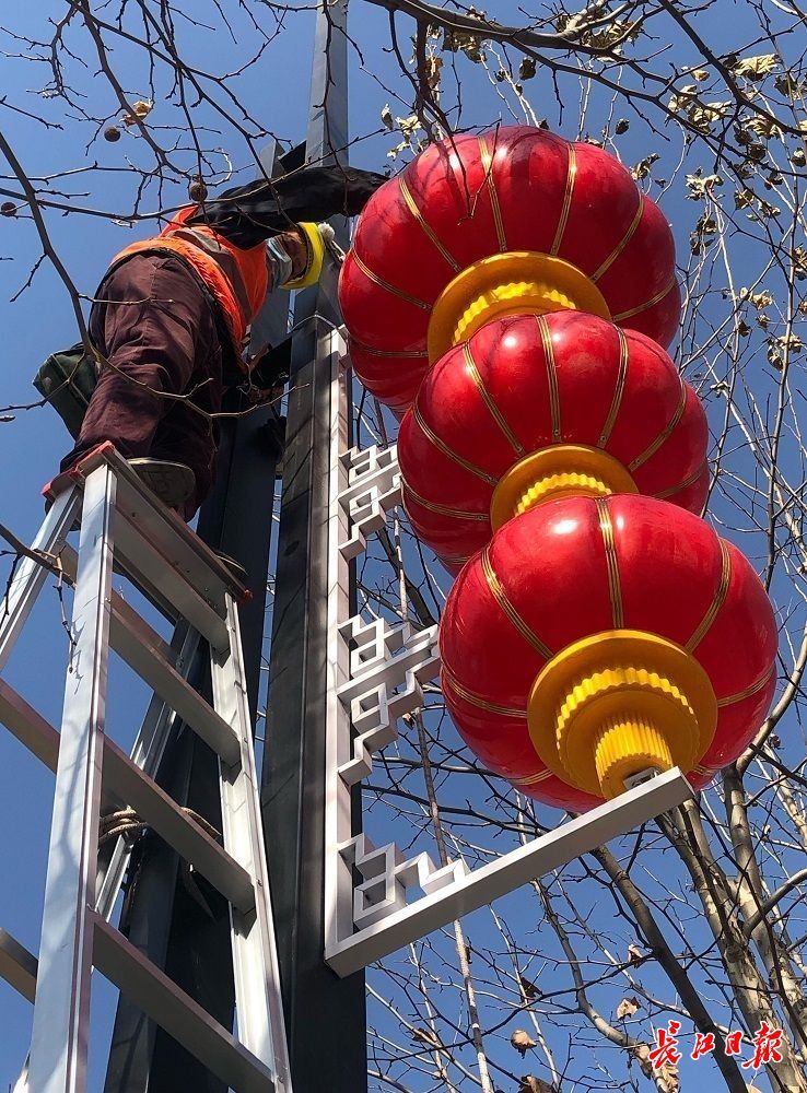 1月15日,武昌临江大道沿线,几名工作人员正在忙着逐一安装大红灯笼,迎接农历新年的到来。记者刘斌 摄