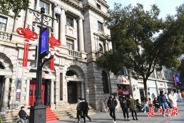 1月17日,江汉路步行街上,工作人员将一对对“中国结”挂上智慧路灯杆,迎接农历新年的到来。 记者苗剑 摄