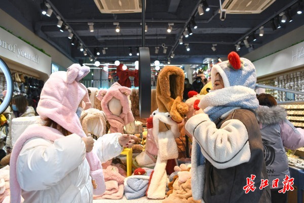 17日,武汉街头,不少市民选购各款造型可爱的毛绒冬帽。记者苗剑 摄