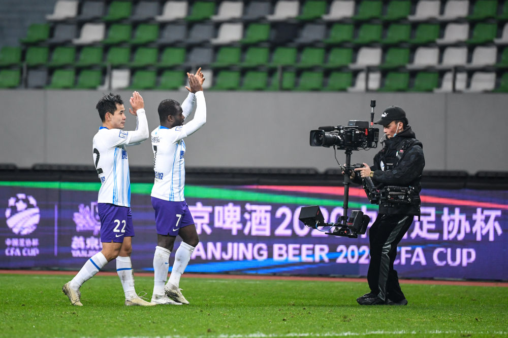 2020年12月5日,天津泰达队球员阿奇姆彭(左二)与队友郭皓赛后向球迷致意。新华社记者 李博 摄