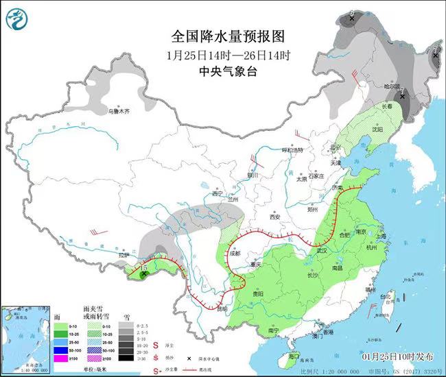 对于冷空气是否带来雨雪天气,张芳华表示,第一次冷空气过程相伴的雨雪天气范围较广。25日至26日,内蒙古东北部、东北地区大部有小到中雪或雨夹雪,其中,辽宁东北部、吉林中部、黑龙江中部偏南和东部等地部分地区有大雪,局地有暴雪,新增积雪深度1~3厘米,局地5厘米以上;主要降水时段为25日夜间至26日白天。此外,25日至27日,黄淮、江汉、江淮、江南、西南地区东部、华南西部和北部等地有小到中雨。