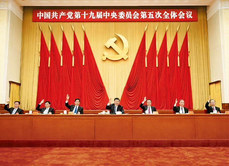 中国共产党第十九届中央委员会第五次全体会议,于2020年10月26日至29日在北京举行。这是习近平、李克强、栗战书、汪洋、王沪宁、赵乐际、韩正等在主席台上。新华社记者王晔摄