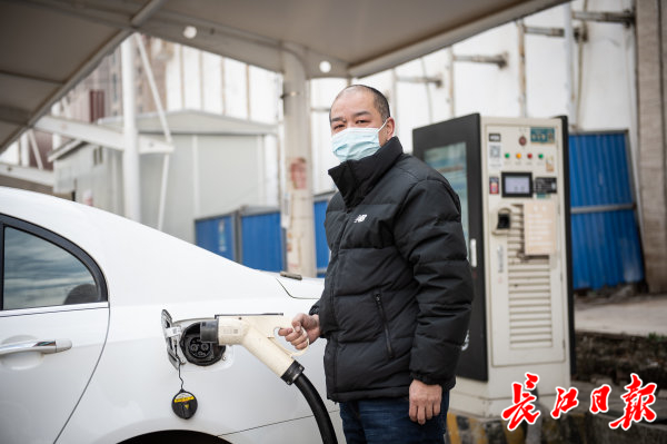 2021年1月14日,在长江乐充崇文站新能源汽车充电站内,专车司机朱先生给车辆充电。记者任勇 摄