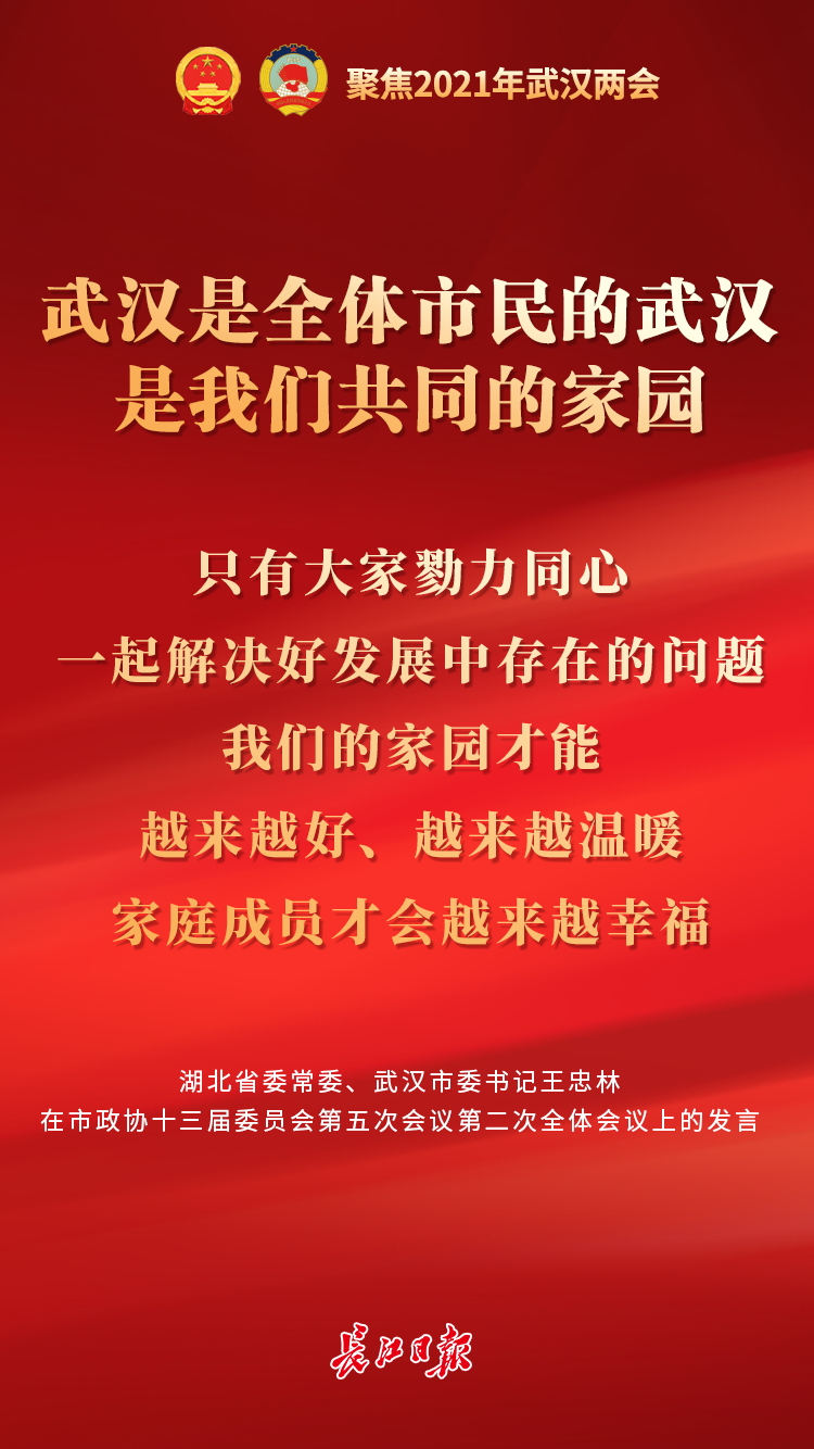 “武汉是全体市民的武汉,是我们共同的家园,只有大家勠力同心,一起解决好发展中存在的问题,我们的家园才能越来越好、越来越温暖,家庭成员才会越来越幸福。”王忠林说,今天的武汉,站在新的发展起点上。面对习近平总书记“三个一定能”的殷殷期望,面对省委 “一主引领”的鞭策和期许,面对市委描绘的“十四五”发展蓝图,我们重任在肩。希望各位委员发挥独特优势,积极履行政治协商、民主监督、参政议政职能,携手在提升创新策源功能、构建现代产业体系、打造“双循环”重要枢纽、强化“一主引领”作用、建设美好生活新家园五个方面共同发力,展现新作为、实现新突破。