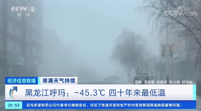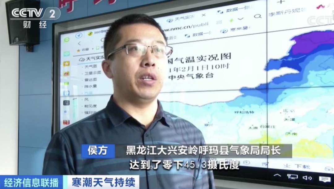 黑龙江大兴安岭呼玛县气象局局长 侯方:2月1日监测到极寒最低气温达到了零下45.3摄氏度,是四十年来最低值。预计2月3日后,气温略有回升。