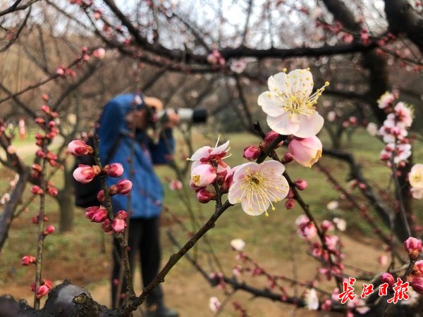 东湖梅园梅花绽放,吸引了摄影爱好者驻足拍照。记者何晓刚 宁秀梅 摄