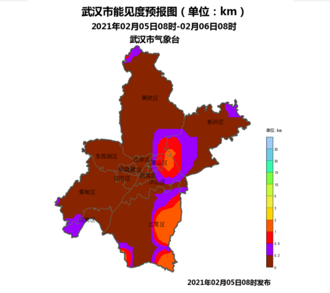 根据“武汉气象”官微的发布的消息,武汉未来24小时能见度较差,请注意防范。能见度预报图显示,全市所有区域的能见度都不太高。