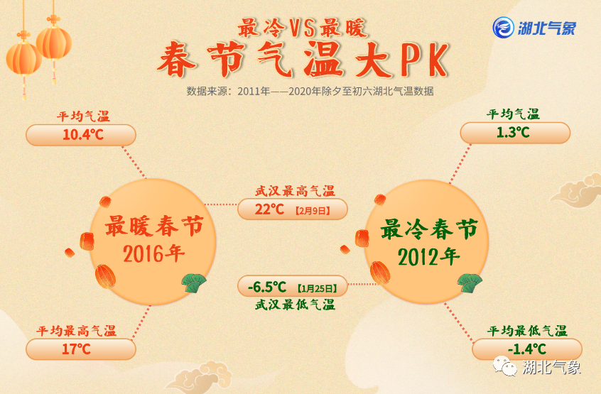 2012年春节最冷,全省平均气温1.3℃,平均最低气温-1.4℃,期间极端最低出现在1月25日,只有-3.8℃,武汉当天低温为-6.5℃。