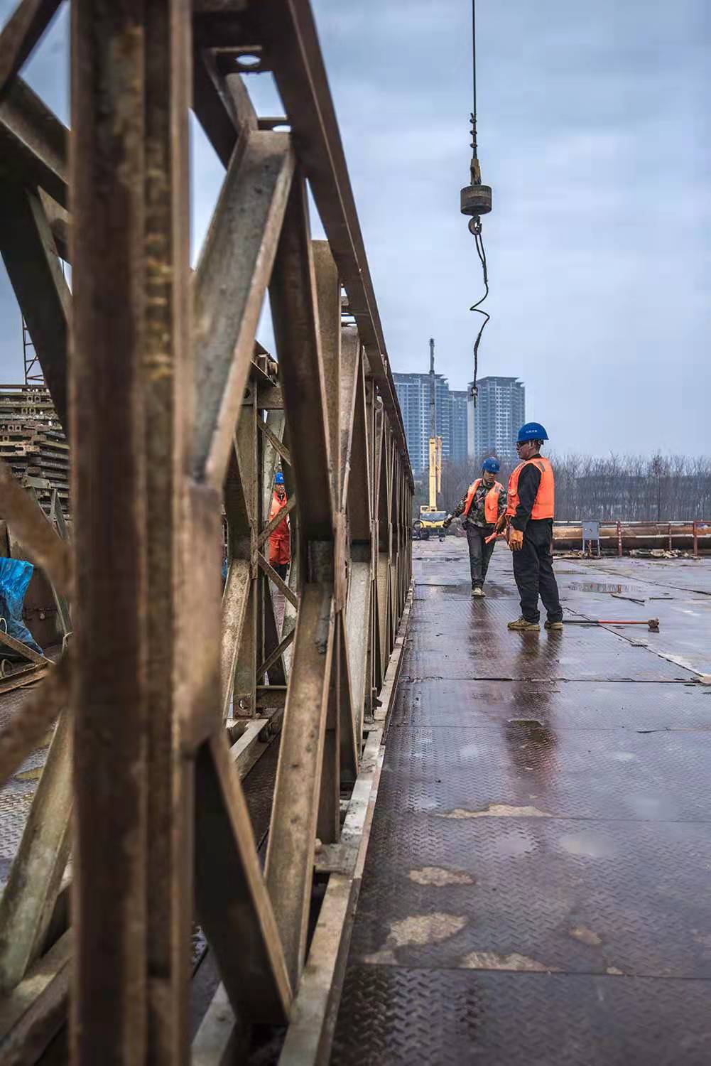 搭建完成的施工栈桥上,工人们忙着拼装箱梁,远处,数台塔吊将钢管柱插入径河水中,发出持续的轰鸣声。刚刚过去的这个春节,设计造型如大鹏展翅的径河五路跨径河桥工程,已经完成了桥梁打桩。曲折绵延的径河两岸,又一座跨河桥梁初见雏形。
