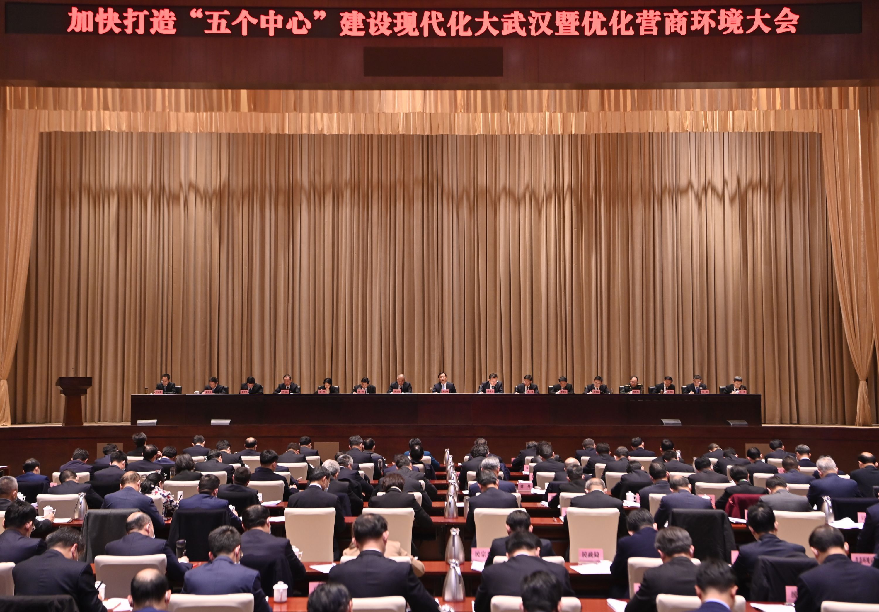大会是动员,也是誓师。会议通报了《加快打造“五个中心”建设现代化大武汉实施意见》和优化营商环境工作情况,各区和牵头单位代表现场签订责任状。