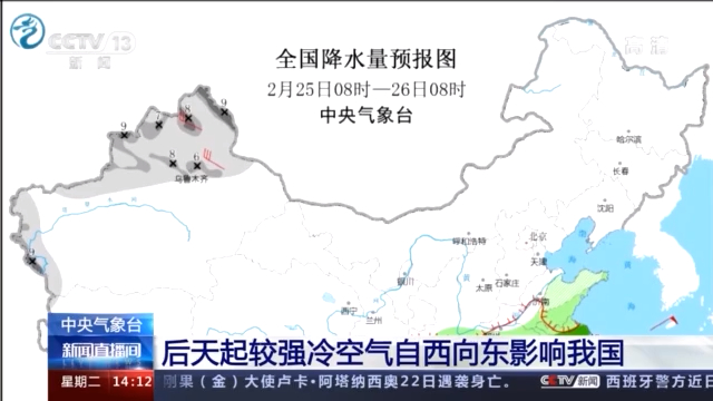 预计25日开始,一股较强冷空气将自西向东影响我国,新疆北部有小到中雪,局地大到暴雪;新疆山口地区将有8~10级大风,阵风11~12级;南疆盆地、甘肃河西地区、宁夏、内蒙古西部等地有扬沙或浮尘天气。提醒受影响地区提前做好防范措施。随着该股冷空气继续东移,27日开始,中东部地区将迎来大范围降水降温。
