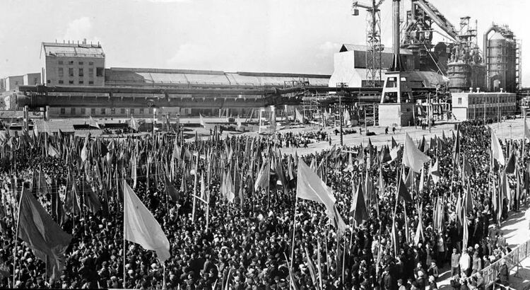 1959年10月15日,在包钢一号高炉前面广场上,举行了出铁剪彩典礼大会。新华社记者李基禄、陆轲摄