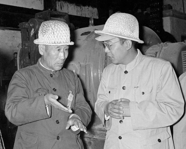 这是孟泰(左)和包钢副经理李超一起研究烘炉出铁的问题。新华社记者陆轲摄(1959年9月22日发)