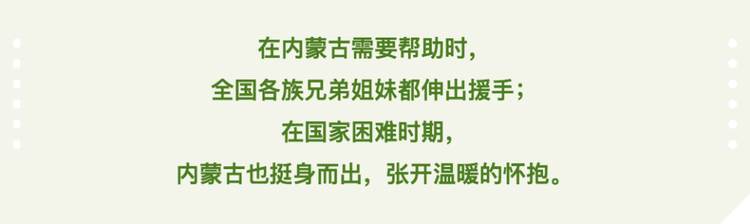 在包钢的困难时期,神州大地同心聚力,全国支援包钢建设、帮助内蒙古;在面对自然灾害的困难时,内蒙古的牧民群众奉献爱与担当,用自己的奶水把“国家的孩子”抚养成人。