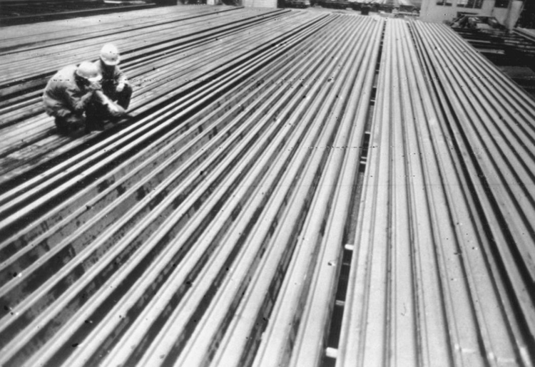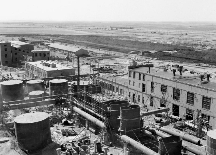 包钢在全国各地大力支援下,加快建设速度。规模巨大的包钢焦化厂第一座炼焦炉就要提前投入生产。图为已竣工的化学回收系统一角。新华社记者陆轲摄(1959年3月31日发)