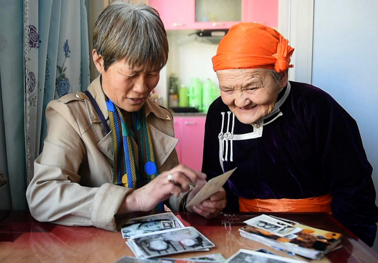 2017年5月10日,“草原母亲”都贵玛(右)和她抚养过的斯日巴勒在一起翻看照片。新华社记者任军川摄