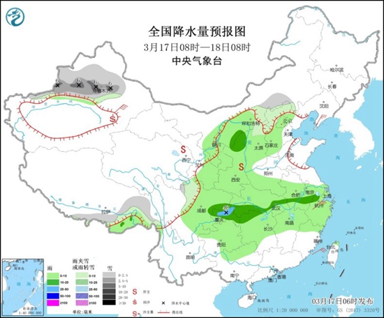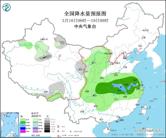 今天(3月17日),冷空气的威力仍在“发酵”,长江中下游一带的气温仍处于持续下跌之中。降水方面,除了黄淮到江南一带依旧阴雨频繁之外,今明两天,西北地区东部、华北等地的雨雪天气也会发展增多,需注意防范。