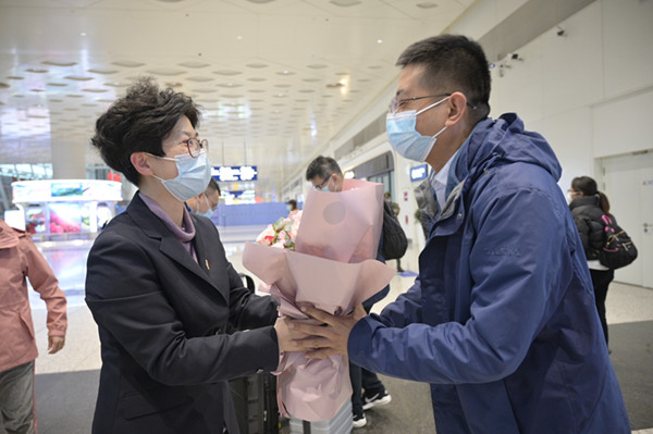 3月19日下午,江苏援鄂医疗队队员乘坐高铁抵汉。 通讯员张全录 摄