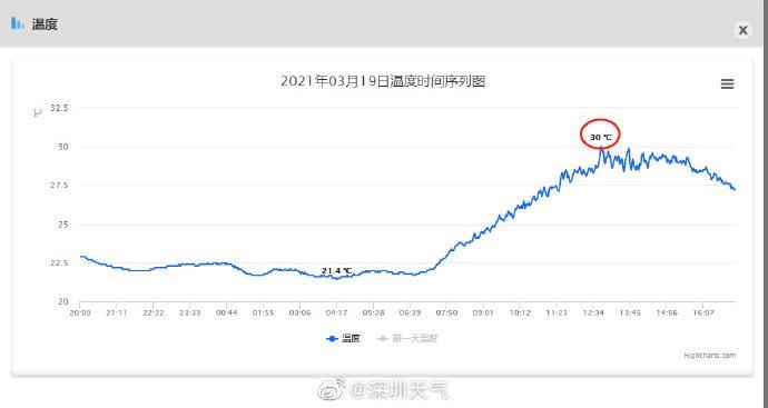 破纪录了!深圳今日最高气温30.0℃ 2021-03-19 18:32 @深圳天气 0 深圳国家基本气象站今日(3月19日)最高气温30.0℃,破当天历史极值(历史最高29.6℃),为3月中旬历史同期第三高。 (原标题《破纪录了》)