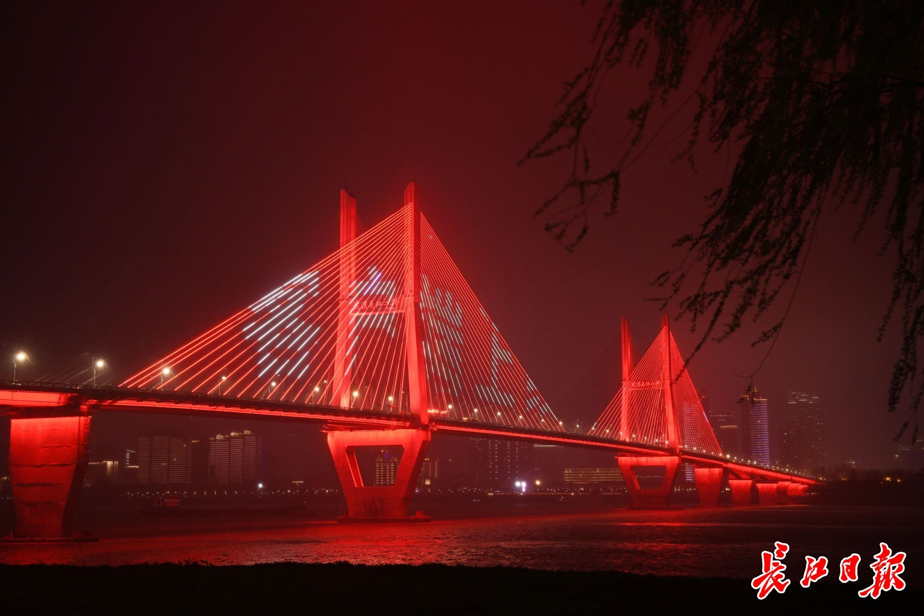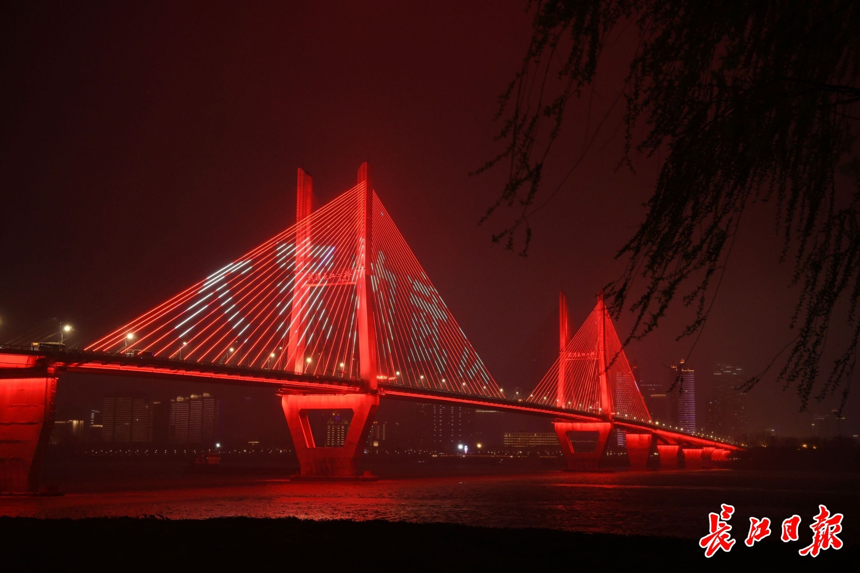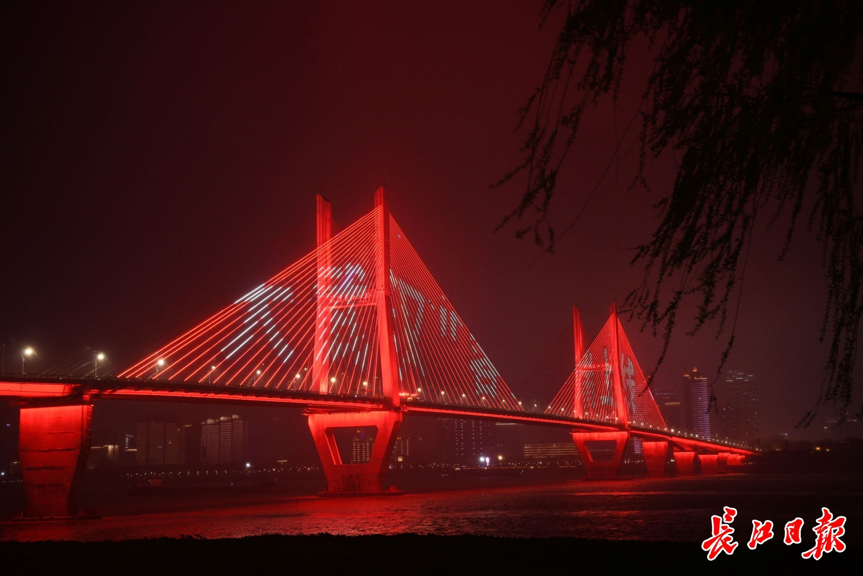 19日晚,武汉长江灯光秀,长江二桥上亮起“大武汉客户端上线”字样。