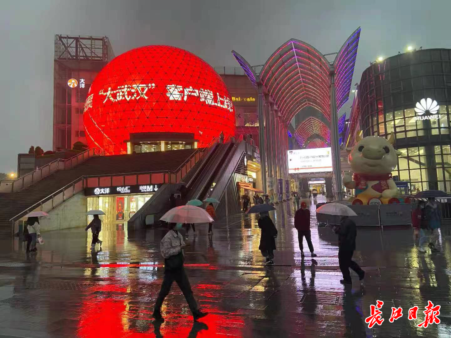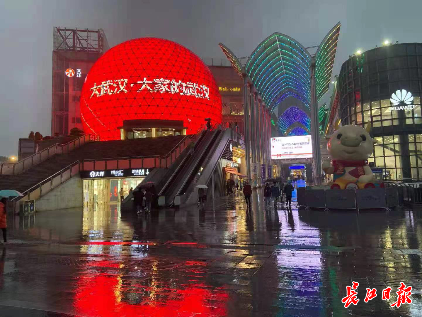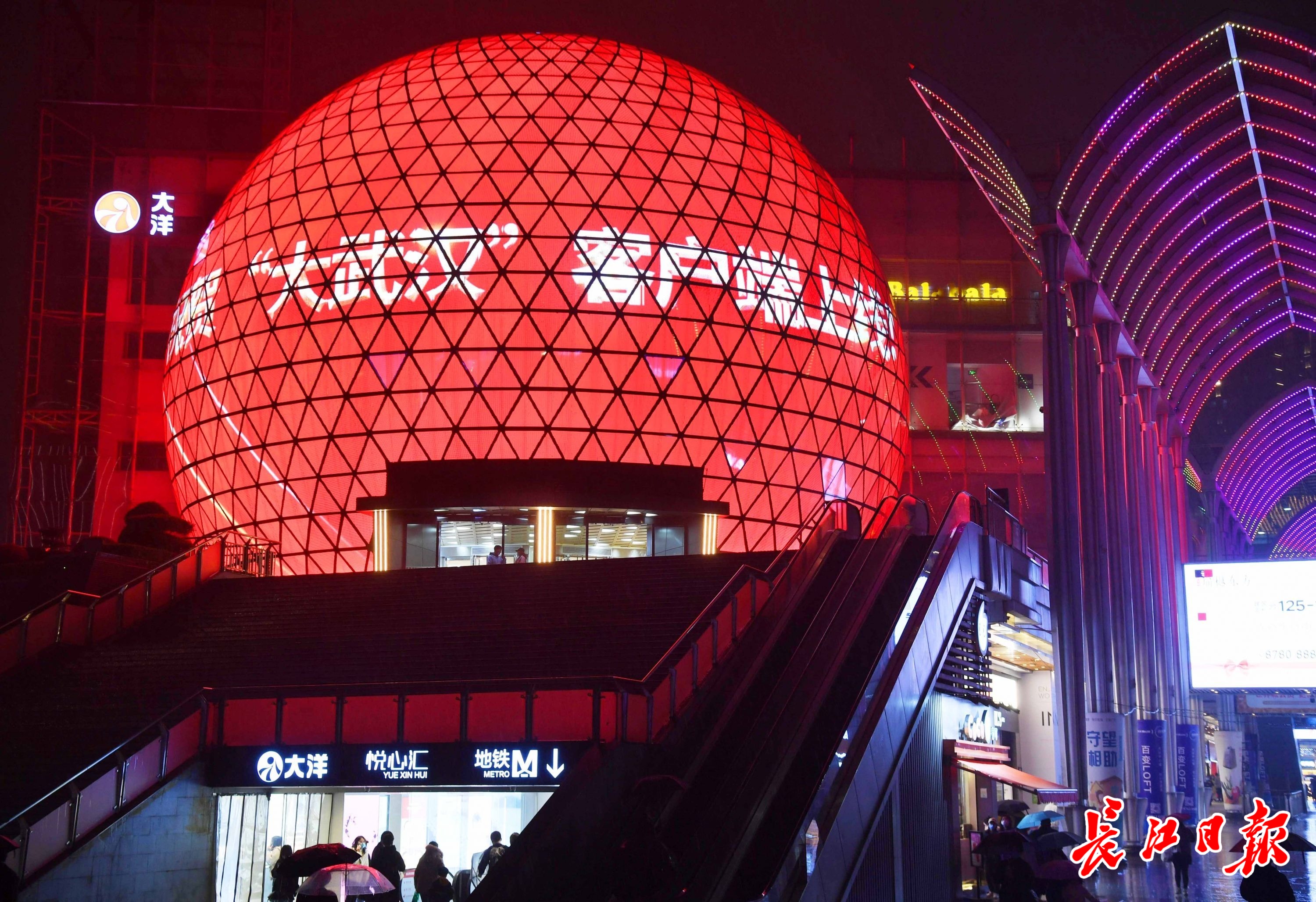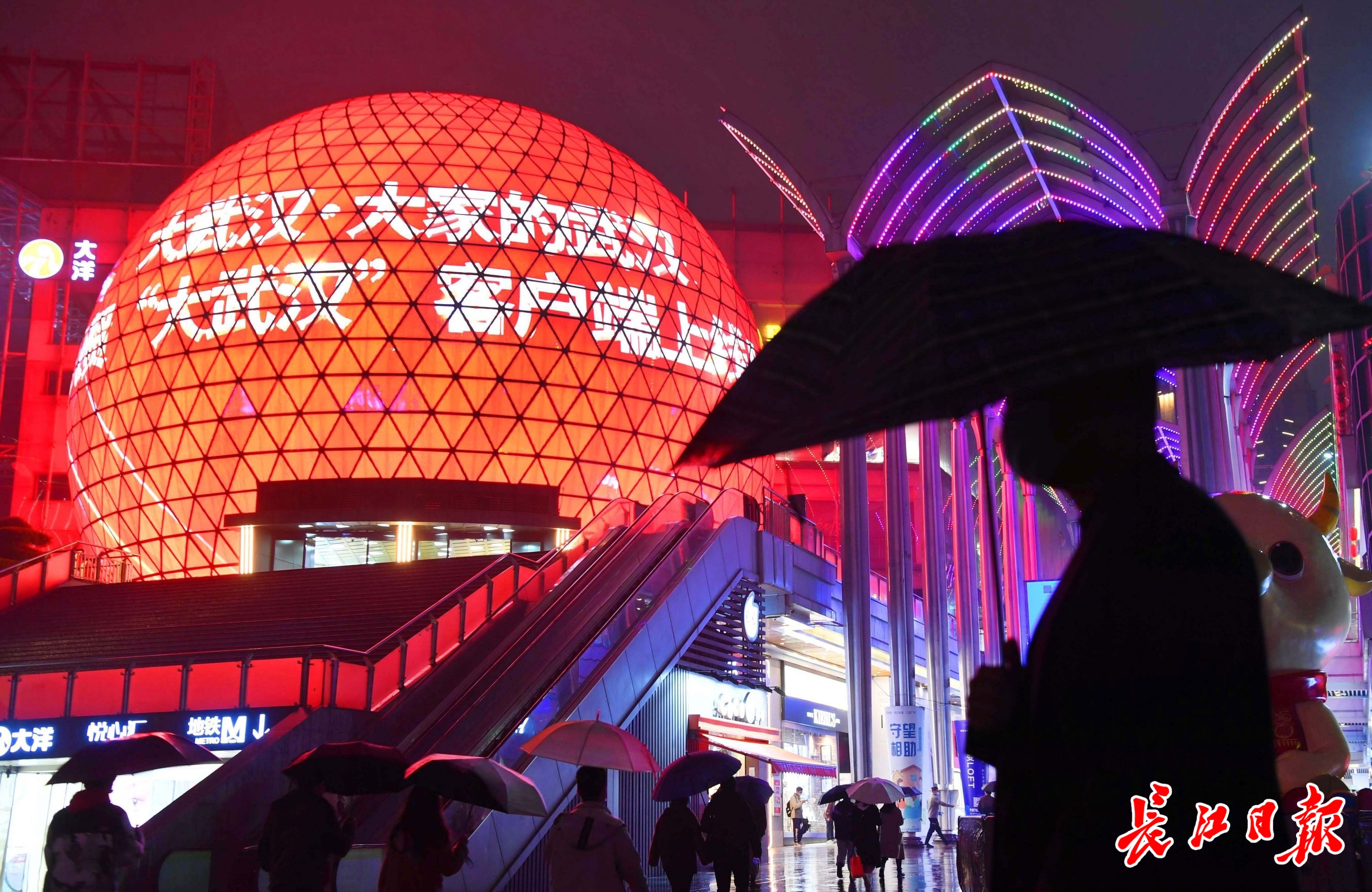 19日晚,在光谷步行街街口,高达30米的LED球屏上出现了“大武汉·大家的武汉”“大武汉客户端上线”字样。