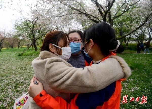 樱花树下,李海英(左)深情拥抱汪洁(右)、詹丽丽(中)。 记者史伟 摄