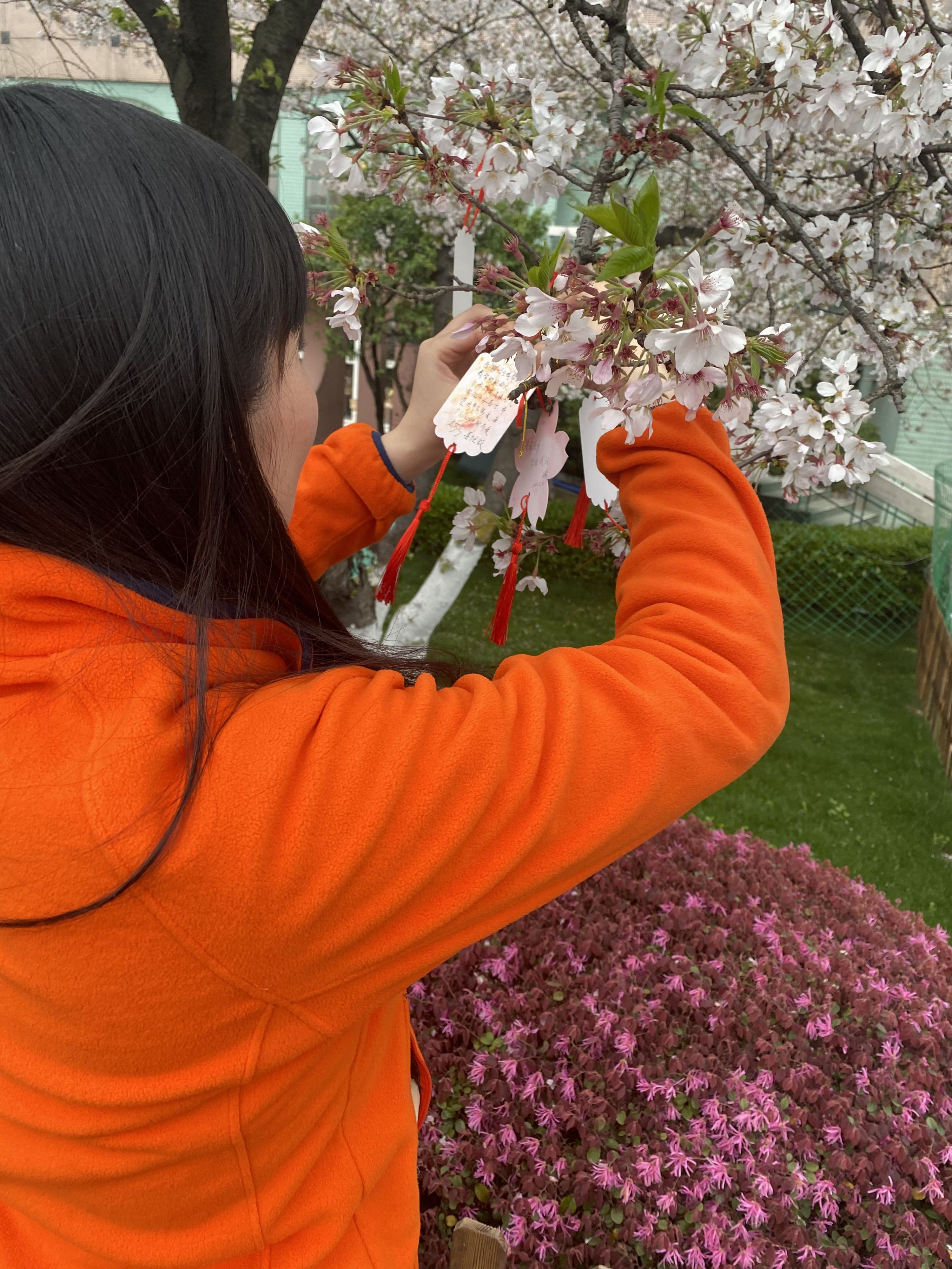 江苏第三批援鄂医疗队队员重返晴川假日酒店,在樱花树下写心愿卡。记者黄丽娟 摄