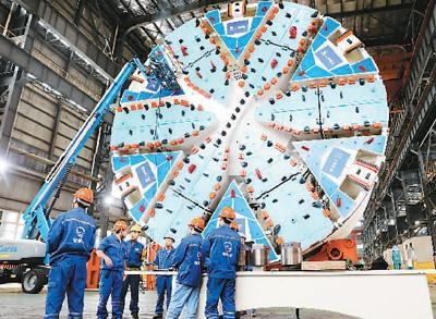 | 工人在隧道股份上海隧道工程有限公司自主研制的超大直径盾构机“骐跃”旁讨论交流。 新华社记者 方 喆摄 |