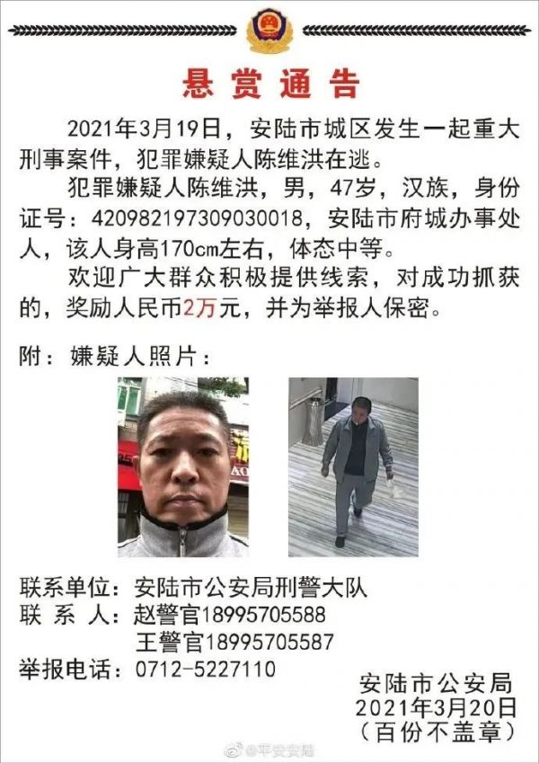 湖北发生一起重大刑事案件 发现此人立刻报警! 2021-03-22 13:29 凤凰网湖北 0 2021年3月19日,安陆城区发生一起重大刑事案件,犯罪嫌疑人陈维洪在逃。欢迎广大群众提供线索,对成功抓获的,奖励人民币2万元,并为举报人保密。 来源:平安安陆