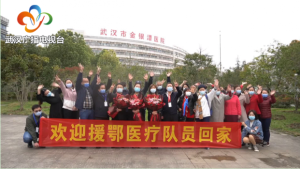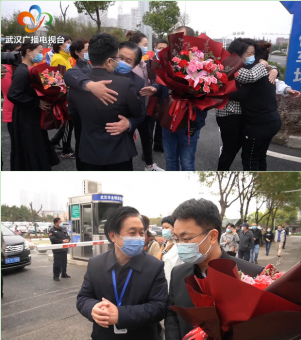 上海队的队员们在金银潭医院和志愿者、治疗康复的病患们久别重逢,大家也仿佛是熟悉的一家人,互相攀谈、问候。一位康复病友对施巍说,现在就看我这个样子都很健康了,长胖了二十几斤。大家纷纷会心一笑。施巍说,现在到了武汉,看到火车站这么多人,然后出去逛逛马路上这么多人,感觉真的一片祥和、一片繁荣。