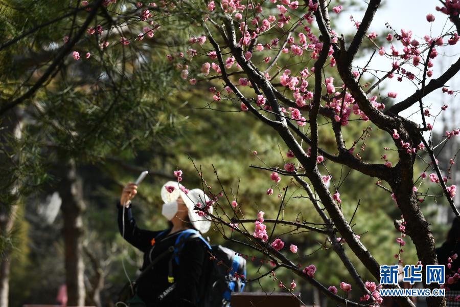 3月24日,游客在北京中山公园拍摄盛开的梅花。新华社记者罗晓光 摄