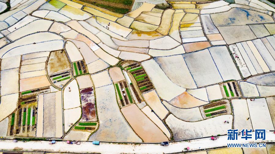 3月24日,广西河池市东兰县武篆镇色故村农民在田间劳作(无人机照片)。新华社发(周恩革 摄)