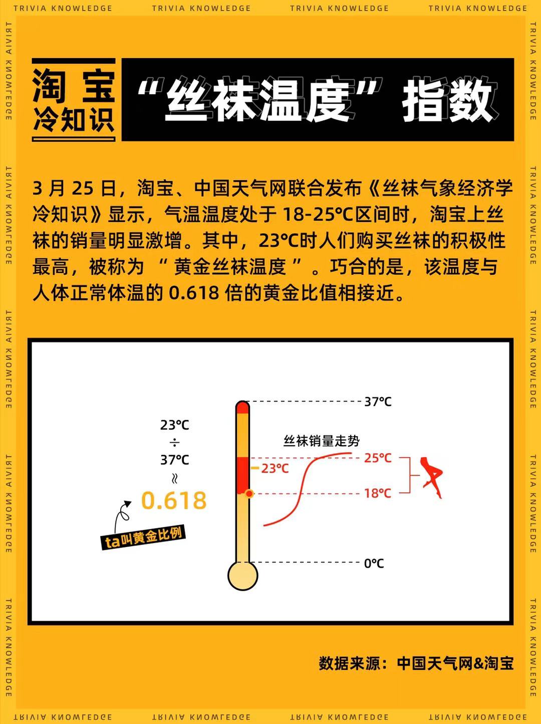 长江日报3月25日讯 淘宝竟然跨界搞起了气象研究!3月25日,淘宝、中国天气网联合发布《淘宝丝袜气象经济学冷知识》。结论表明,当气温位于18~25℃区间时,消费者上淘宝购买丝袜的人数、销量均会激增。其中,23℃时人们购买丝袜的积极性最高,也被称为“黄金丝袜温度”。巧合的是,该温度与人体正常体温(36~37℃)的0.618倍的黄金比值相接近。