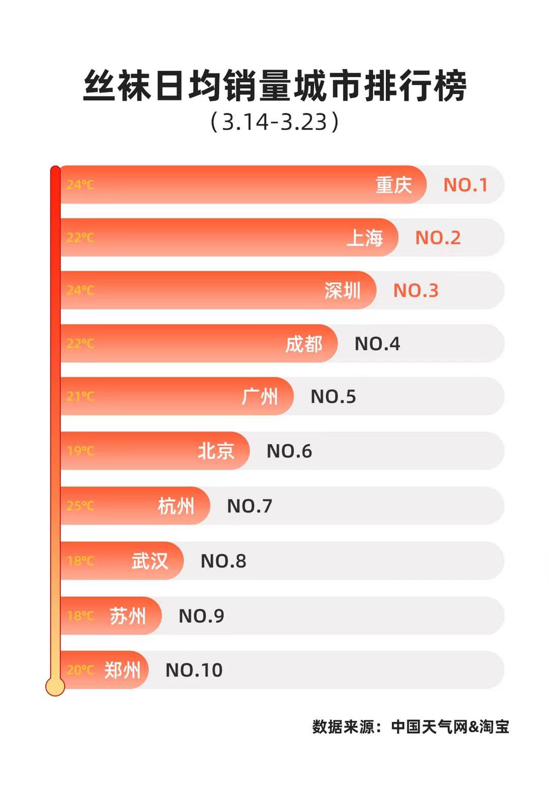 长江日报记者发现,近年来,开春后丝袜的首个购买高峰都与当地气温有关,在当地最高气温在18~25℃时,用户的丝袜购买热情就会高涨。今年,武汉和苏州的消费者对春天的期盼最为“急迫”,分别在3月22日、23日最高温度达到18℃时,出现了丝袜购买波峰。而深圳、重庆的丝袜消费者,分别在5日、14日气温达到24℃时才“买买买”;杭州的消费者则是在15日当天气温突然骤升,被“诱导”加入丝袜抢购大军,随后一周气温大降,杭州人收货后只能再耐心等等。