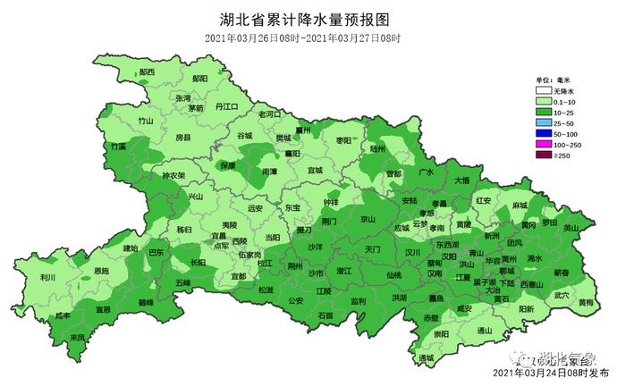 根据最新气象资料分析,预计3月下旬后期荆州市又将转为多阴雨寡照天气,其中3月26~27日有小到中雨,3月29日~4月2日以中到大雨为主,累计雨量一般50~80毫米、局部90毫米以上。另外,4月上旬降水仍将呈偏多态势。