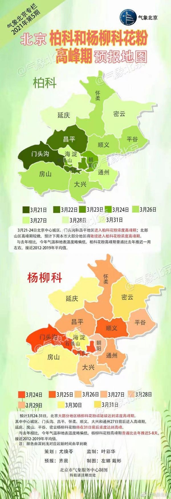 气温时低时高,花粉的影响也有变动。北京市气象台表示,受二月气温偏高影响,今年北京地区柏树和杨柳科花粉始期都比去年有所提前,但是三月以来气温持续低迷和光照不足,花粉高峰期比去年都有所推后。