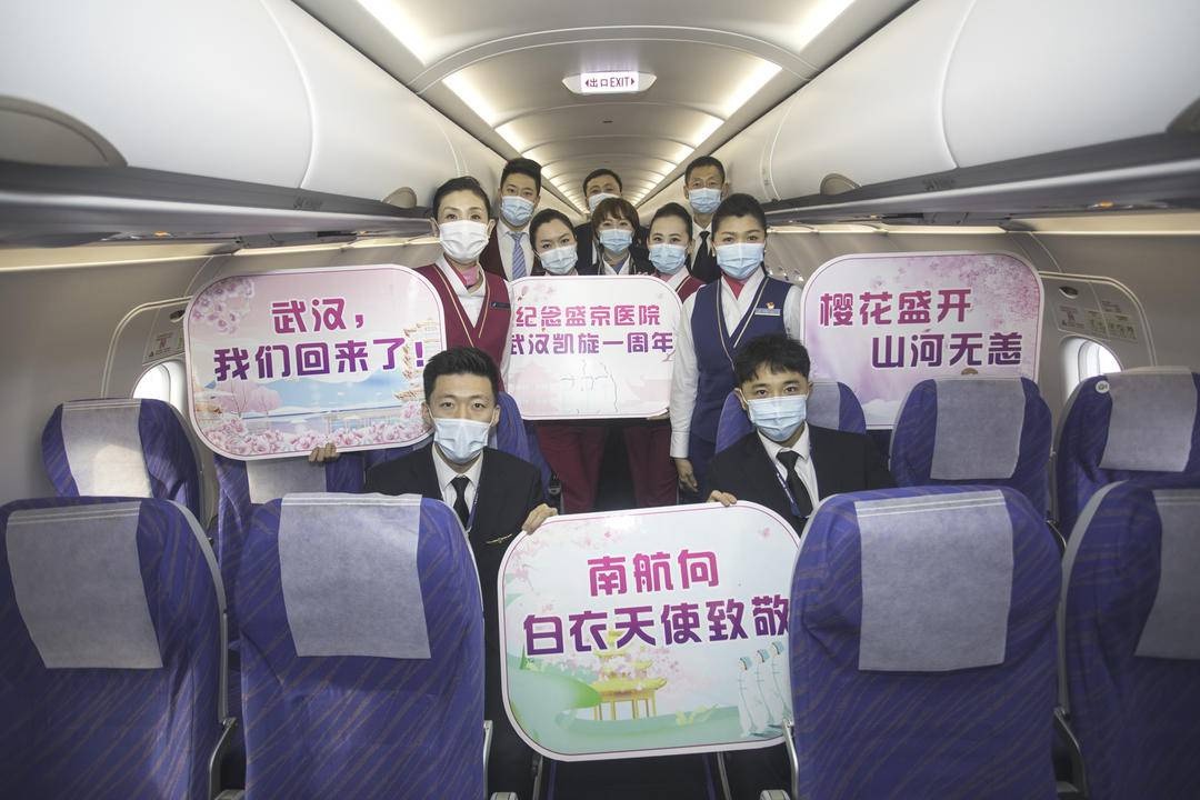 “大家好,我是本次航班的乘务长刘晓燕,非常荣幸再次与你们相聚……今天武汉春暖花开,珞珈樱花绽放,南航有幸陪伴你们再次踏上你们用生命捍卫过的土地,去赴樱花之约……”正在进行播报的CZ6519航班乘务长刘晓燕,曾在去年3月26日—4月1日间,三次前往武汉迎接辽宁医疗队回家,其中就包括这支盛京医院的重症医疗队。