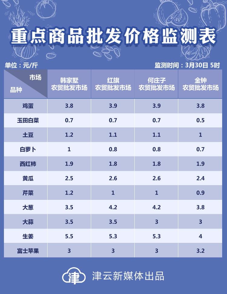 3月30日天津部分农贸批发市场重点商品批发价格监测