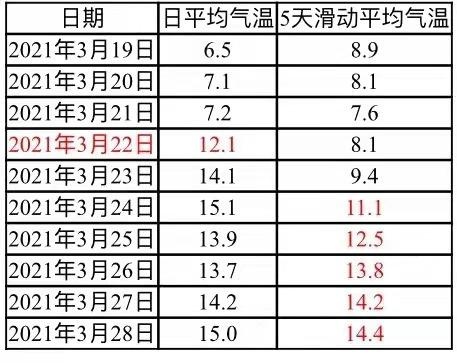 根据中华人民共和国气象行业标准——《气候季节划分》规定:当年五日滑动平均气温序列连续5天大于等于10℃,则以其所对应的当年气温序列中第一个大于等于10℃的日期作为春季起始日,如果初次判断的起始日期比常年偏早15天以上,需进行起始日的二次判断。