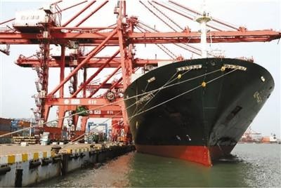 三月三十一日,在江苏连云港港集装箱码头,一艘远洋运输轮在装载集装箱外运。王春摄(人民图片)