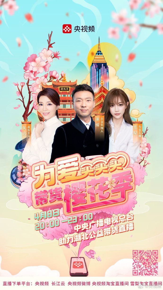 届时,康辉、朱迅携手淘宝主播雪梨Cherie相会武汉,为湖北进行公益直播带货啦!一场“为爱买买买,带货樱花季!”的主题直播将在央视频直播间举办。明晚(周四)晚8:00锁定央视频直播间→https://w.yangshipin.cn/video?type=2&vid=2008347501&pid=600073466,看#康辉朱迅雪梨樱为爱公益直播#,云游江城春景饱眼福,秒杀湖北美食饱口福!