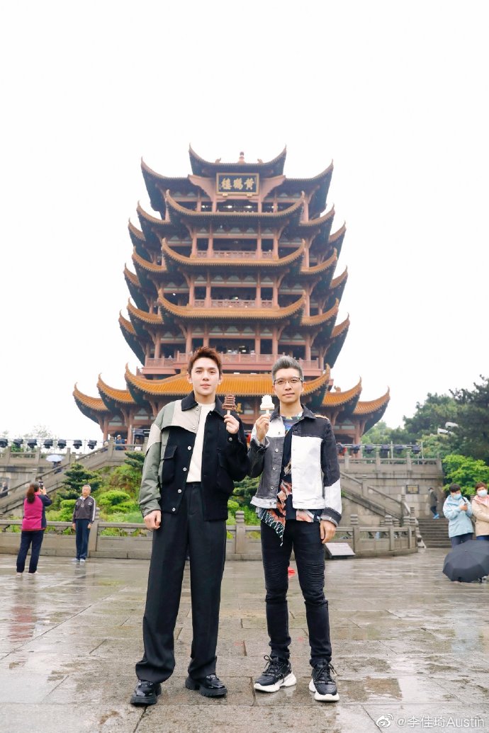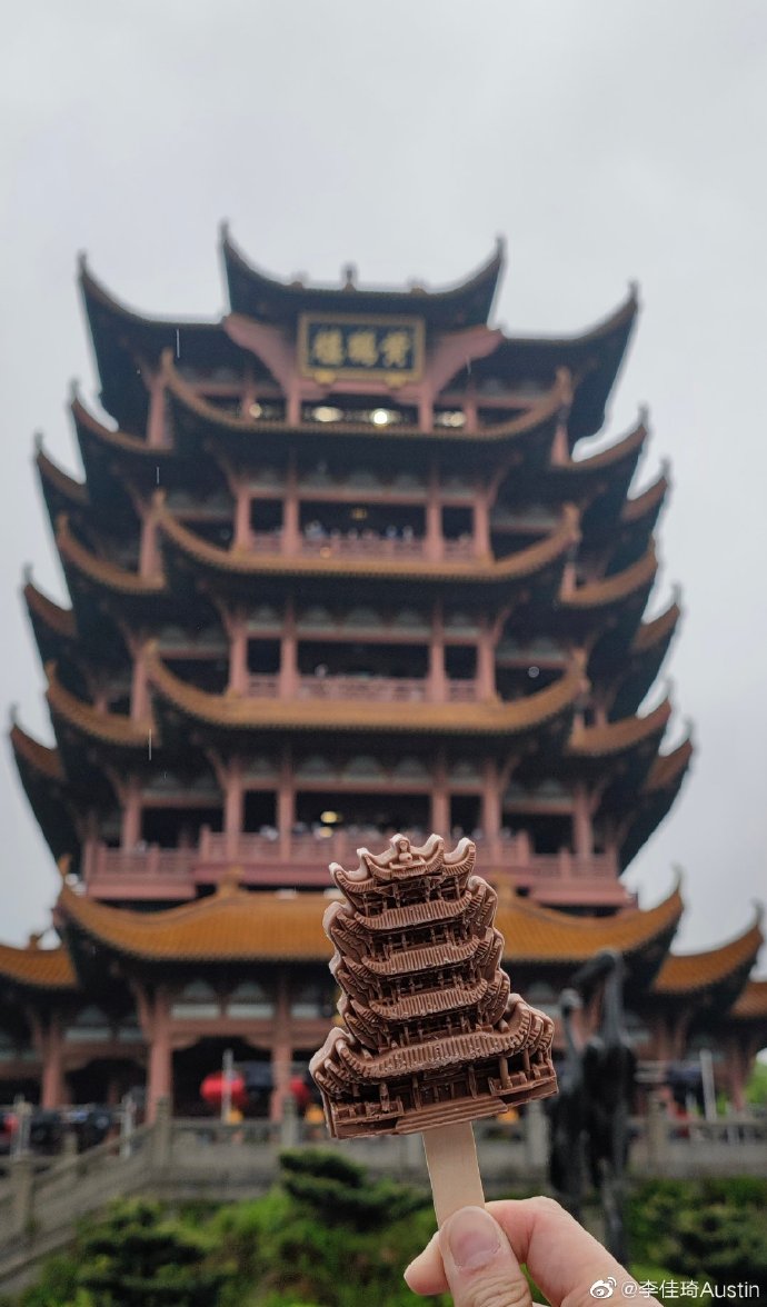 图:李佳琦(左)、朱广权(右)手拿黄鹤楼雪糕在黄鹤楼脚下合影。图片来自李佳琦微博