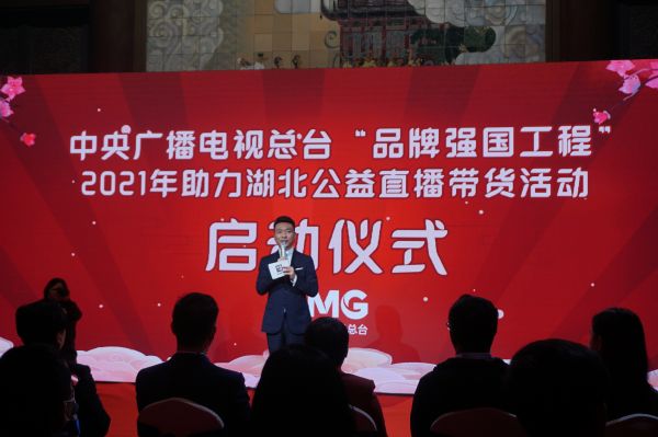 图:康辉在黄鹤楼一楼大厅宣布央视总台“品牌强国工程”2021年助力湖北公益直播带货活动启动。记者张珺摄