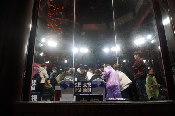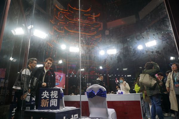 图:4月7日晚,“小朱配琦”在黄鹤楼脚下透明直播间为湖北公益直播带货做准备。记者张珺摄