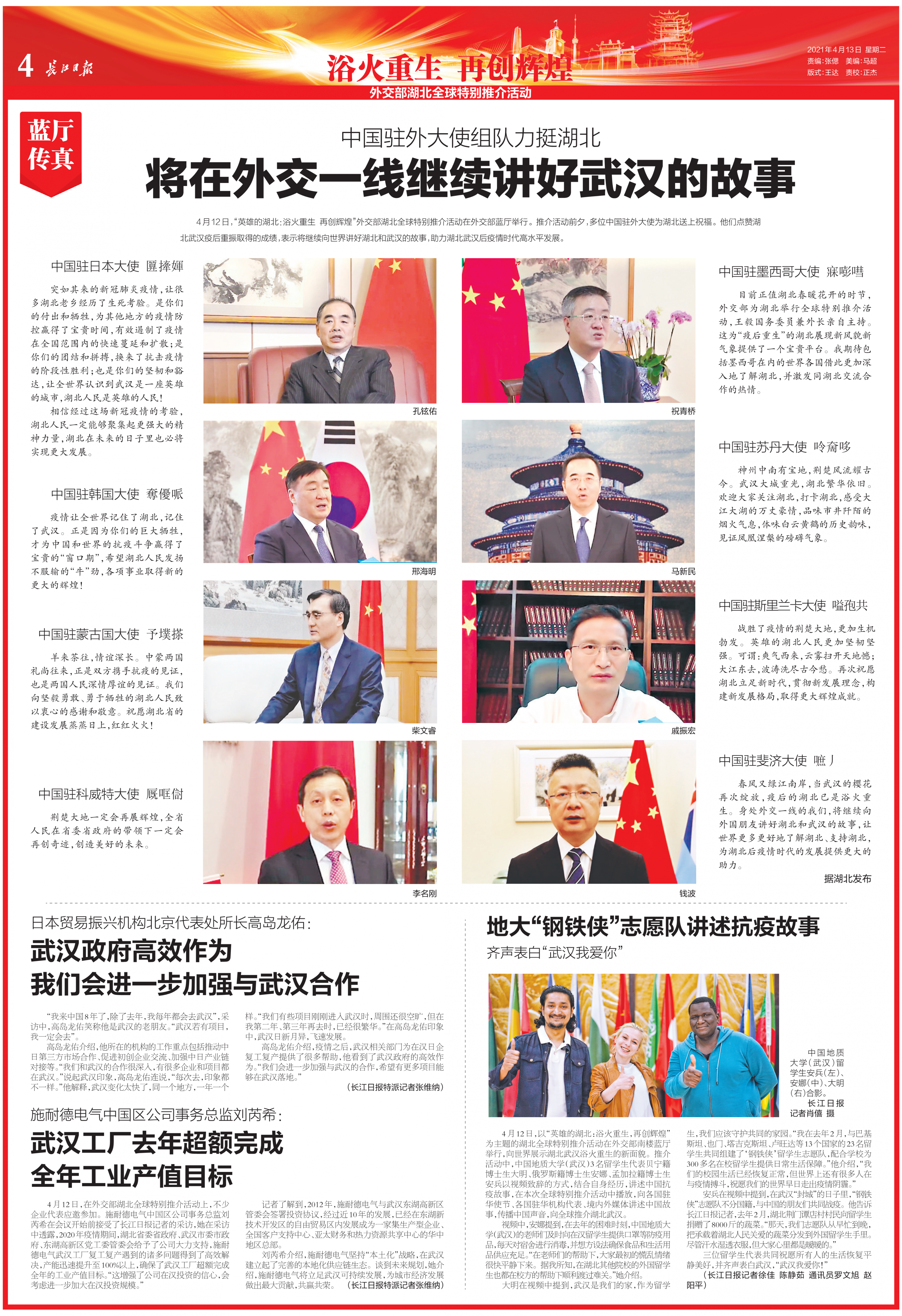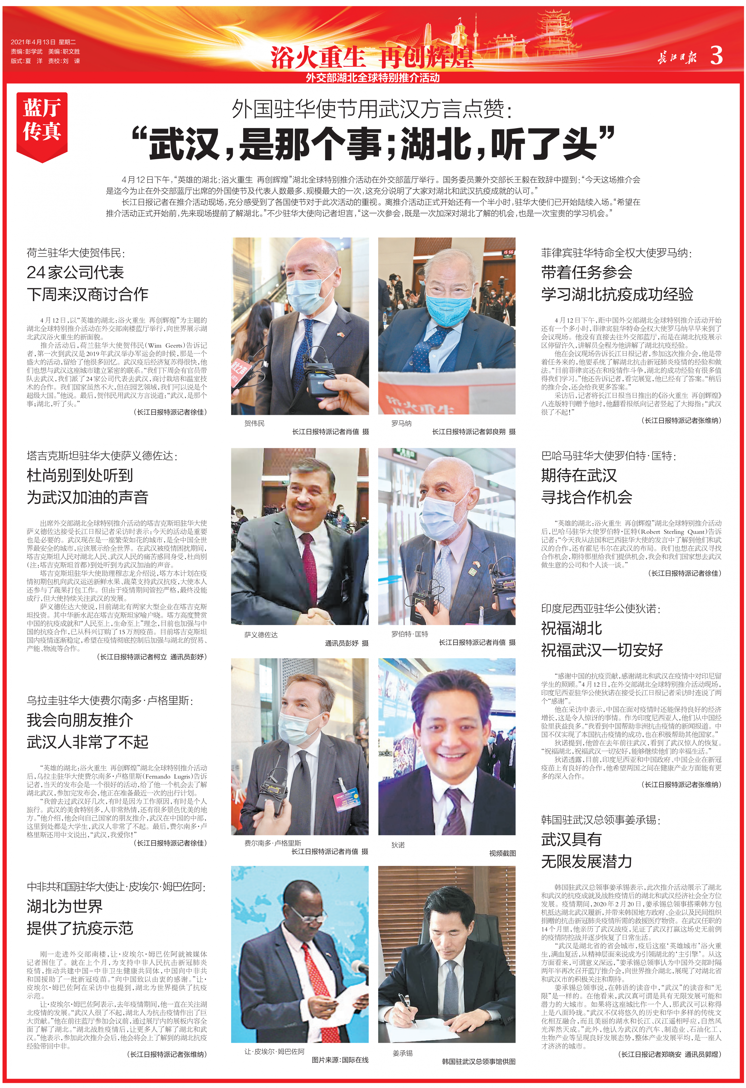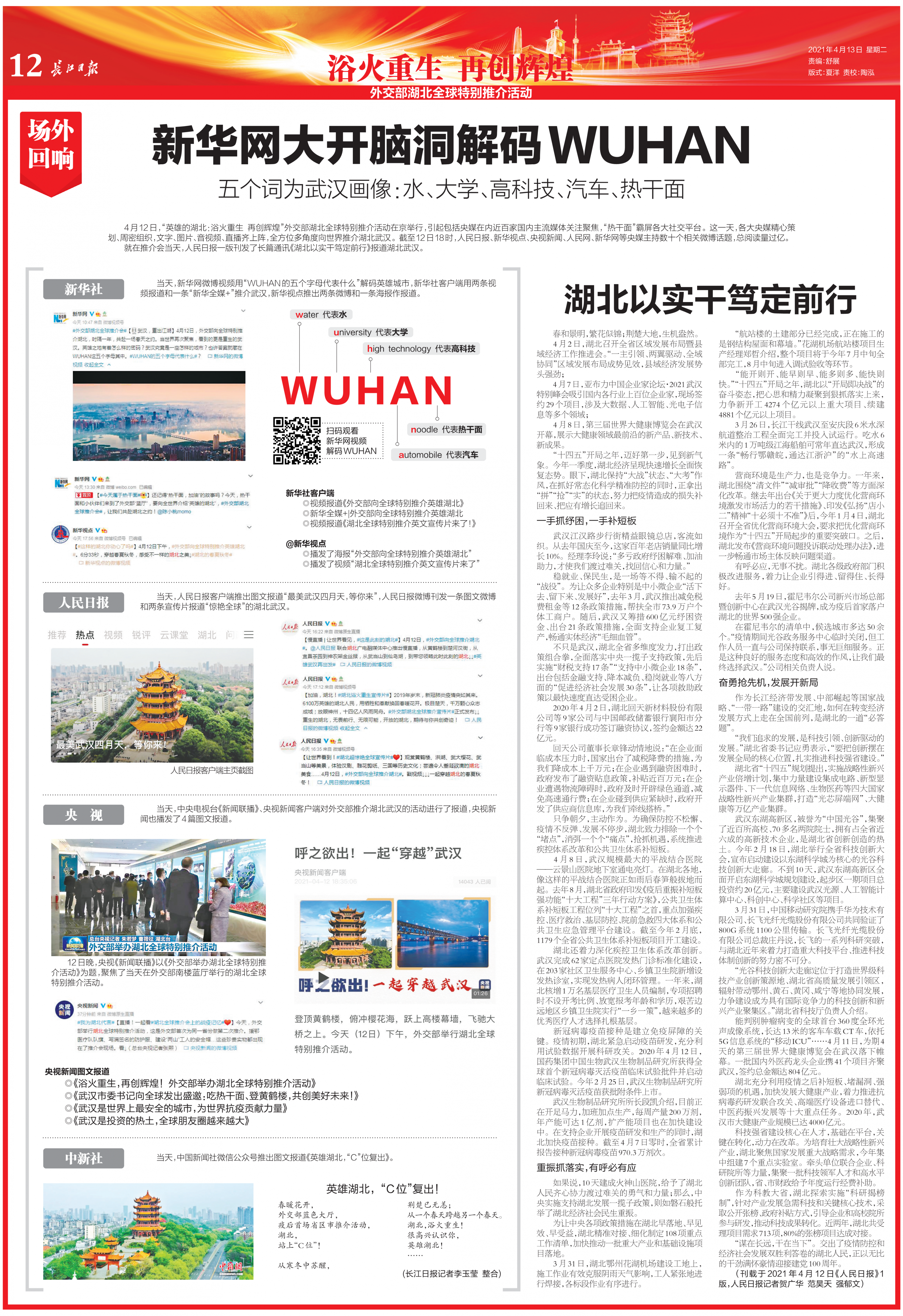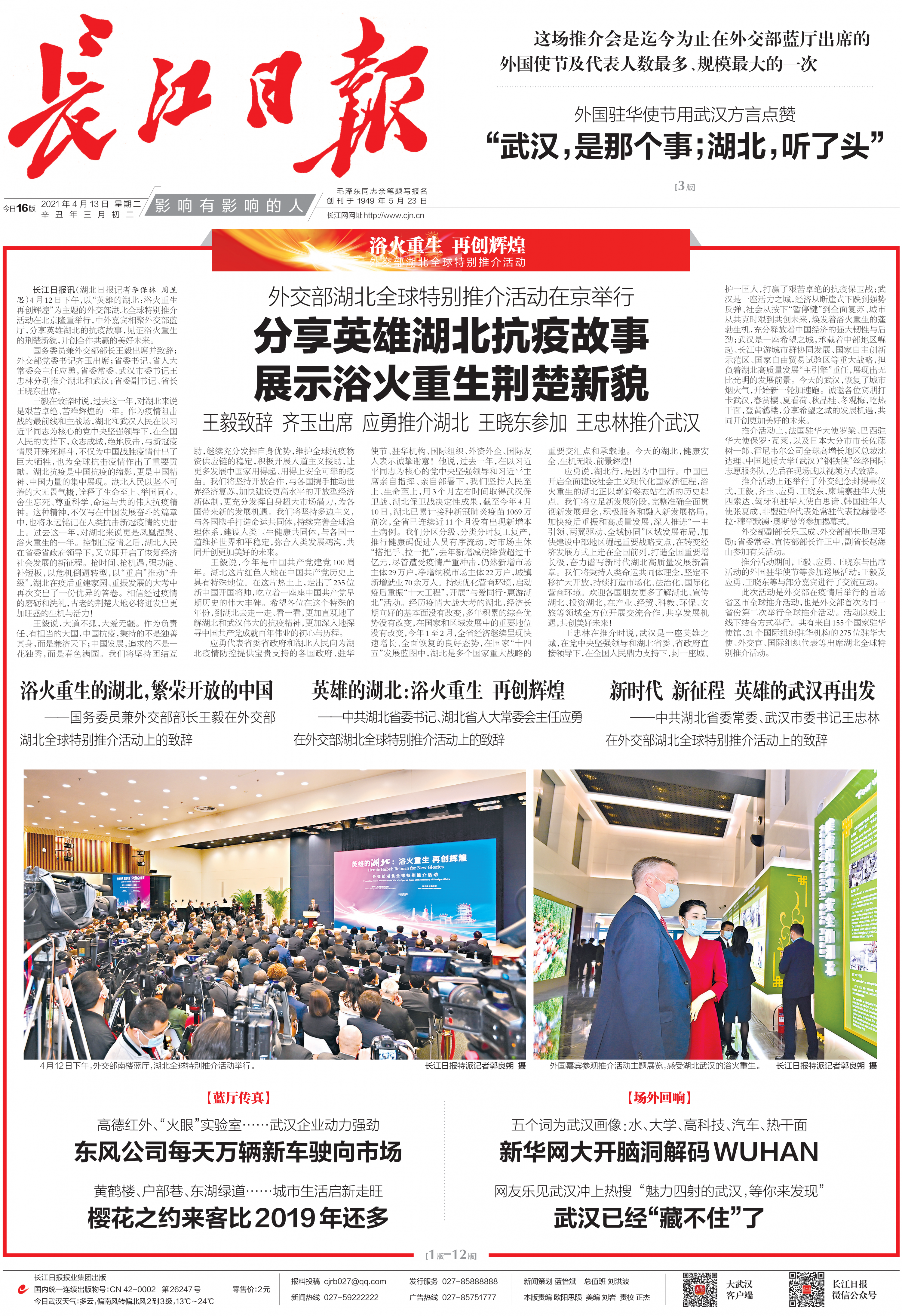 【编者按】4月12日下午,以“英雄的湖北:浴火重生 再创辉煌”为主题的外交部湖北全球特别推介活动在北京隆重举行,中外嘉宾相聚外交部蓝厅,分享英雄湖北的抗疫故事,见证浴火重生的荆楚新貌,开创合作共赢的美好未来。《长江日报》今日推出12个版《浴火重生 再创辉煌》,以下为版面高清大图。