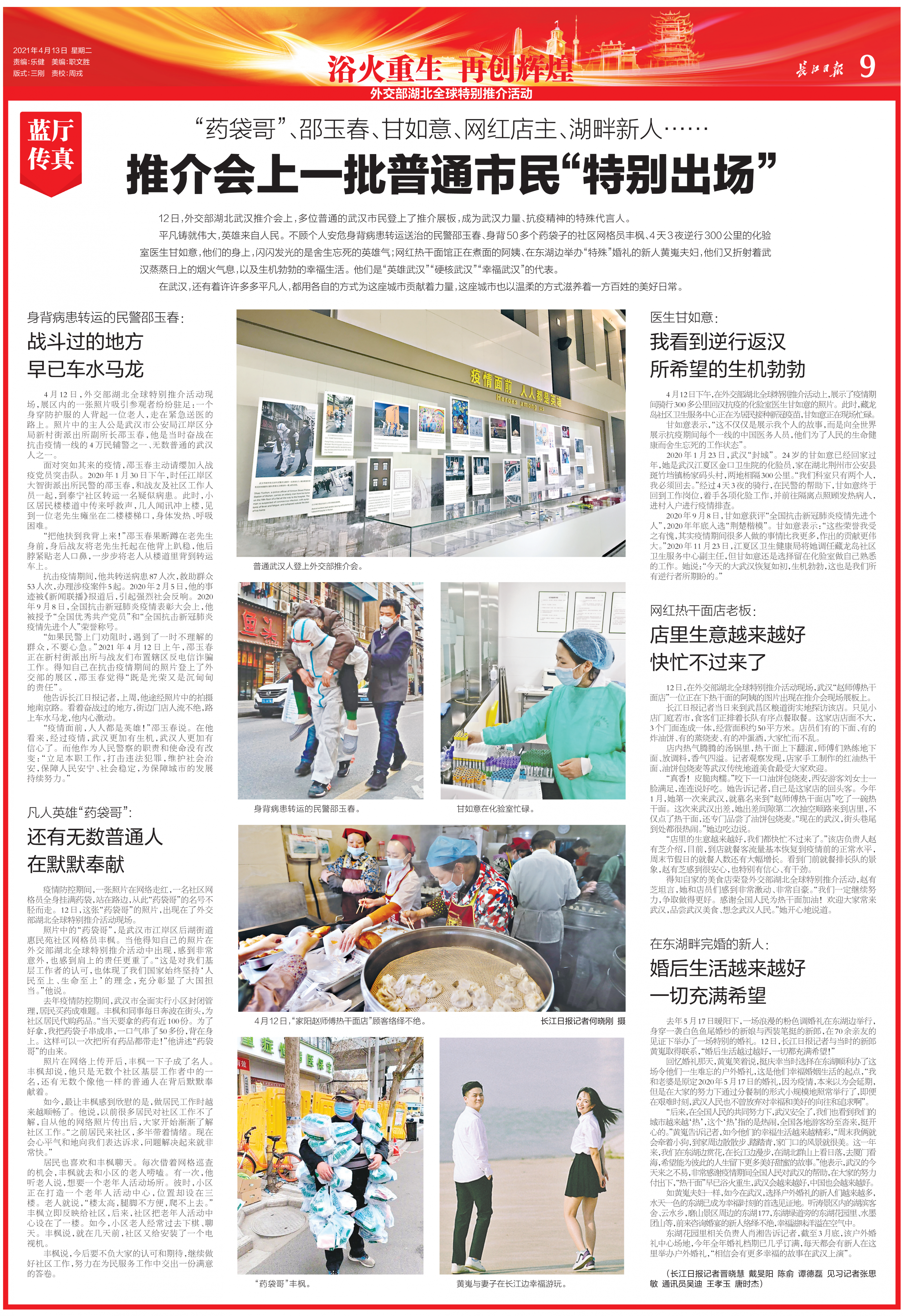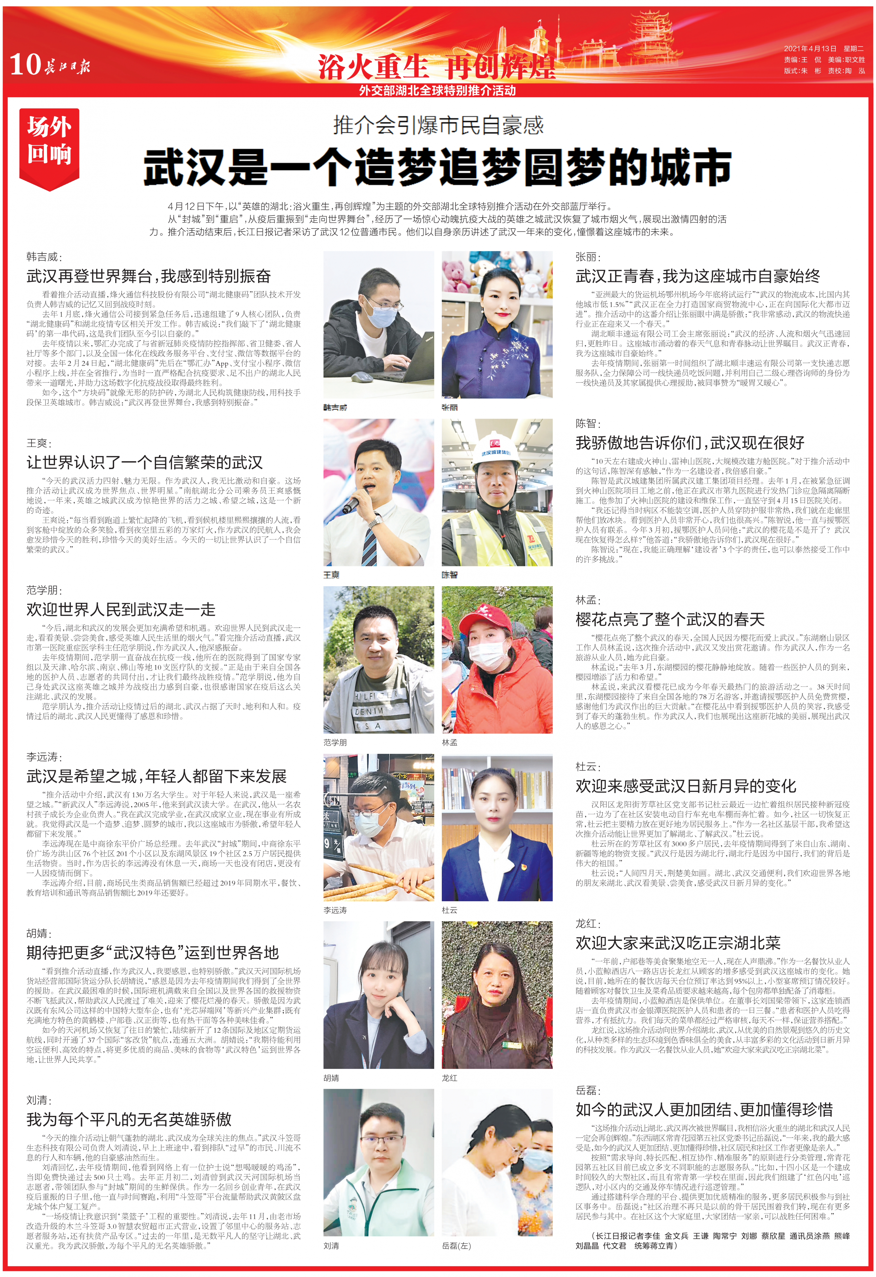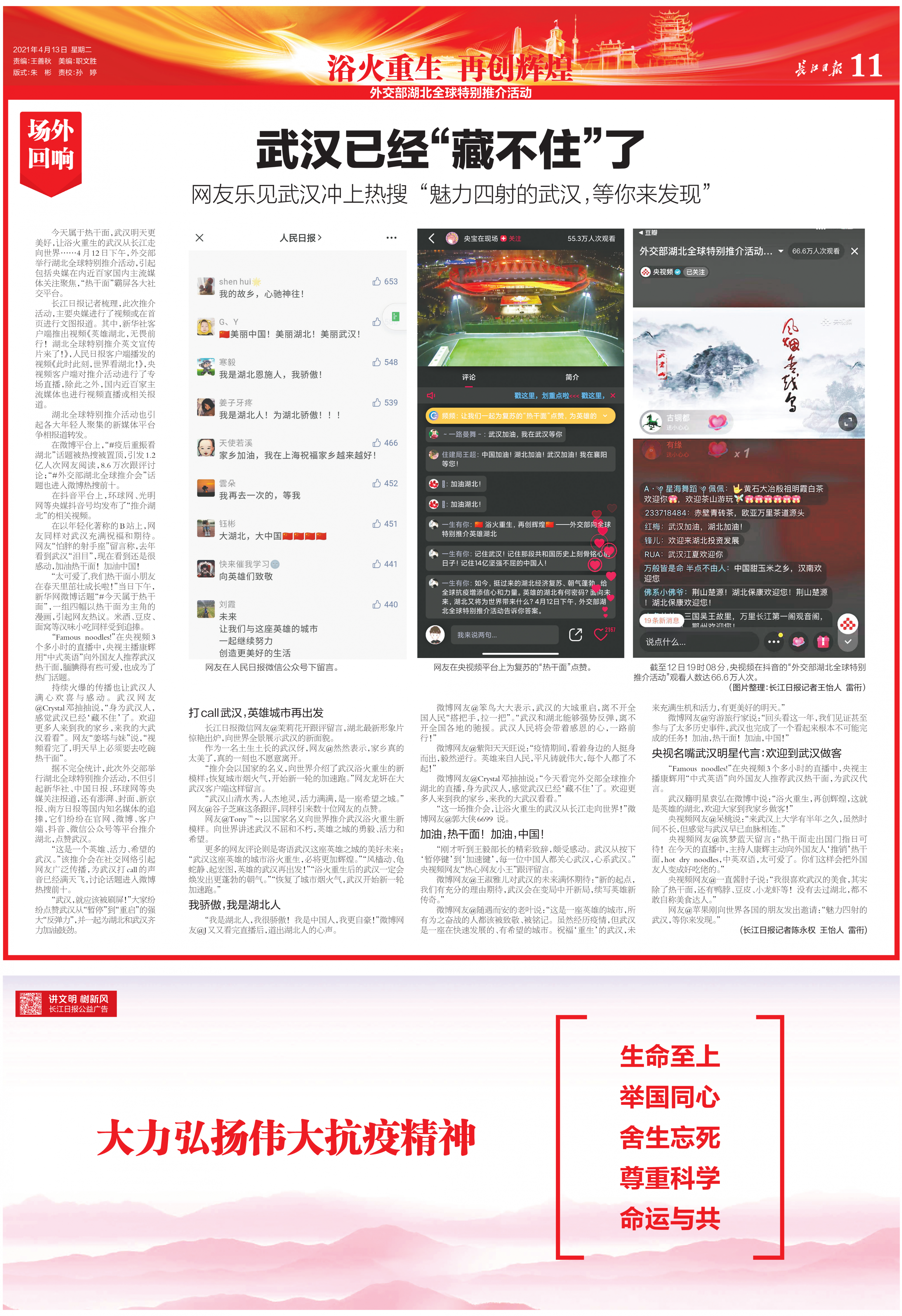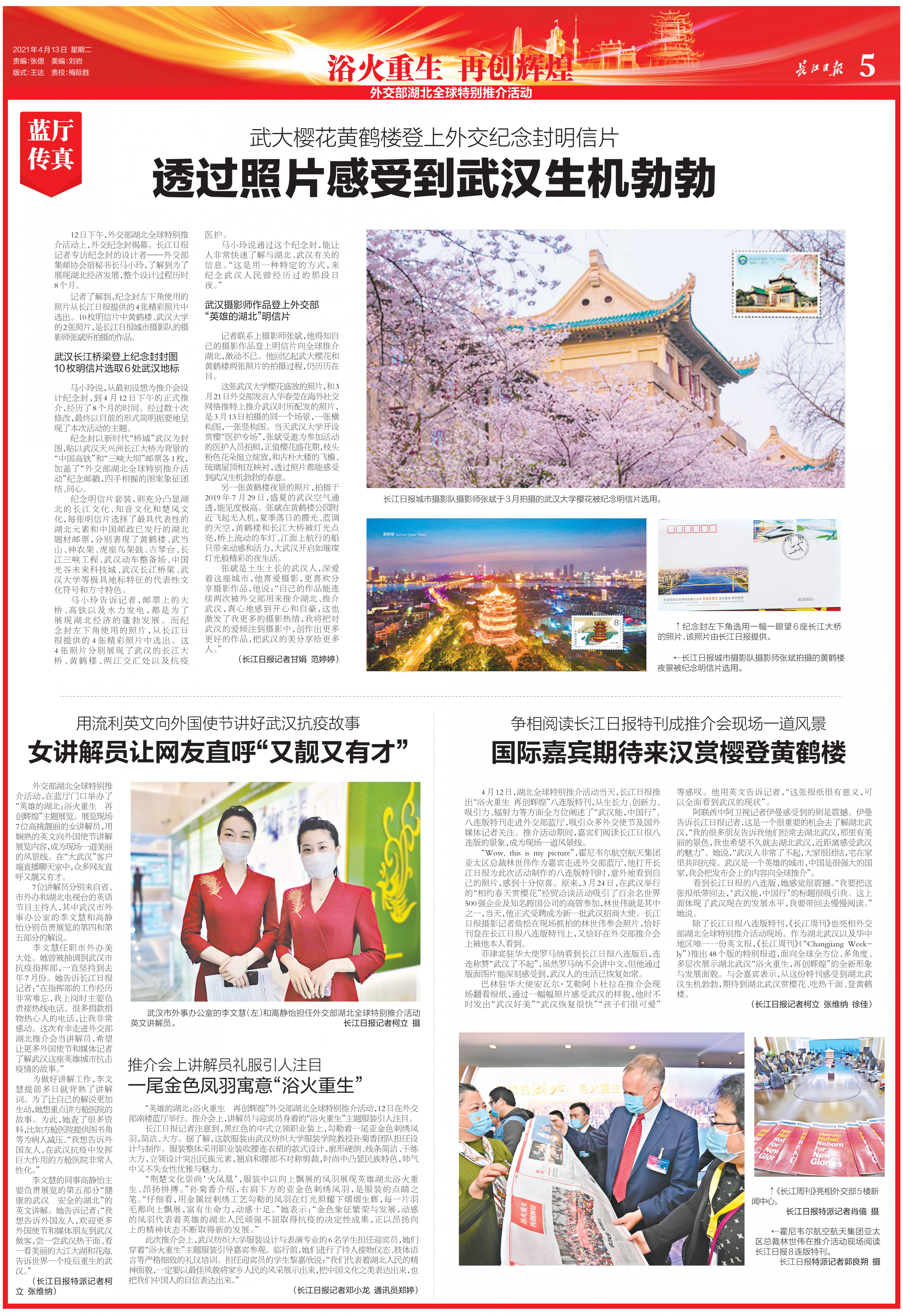 【编者按】4月12日下午,以“英雄的湖北:浴火重生 再创辉煌”为主题的外交部湖北全球特别推介活动在北京隆重举行,中外嘉宾相聚外交部蓝厅,分享英雄湖北的抗疫故事,见证浴火重生的荆楚新貌,开创合作共赢的美好未来。《长江日报》今日推出12个版《浴火重生 再创辉煌》,以下为版面高清大图。