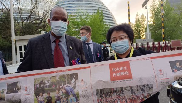长江日报4月13日北京电 4月12日外交部湖北全球特别推介活动结束后,莱索托驻华大使塞特纳尼欣然与长江日报八连版特刊合影留念。他说:湖北医疗队不远万里到莱索托帮助我们抗击新冠疫情,我国人民非常感谢湖北医疗队。