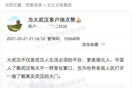 网友“****3532”在武汉城市留言板为“大武汉”客户端点赞,他说:大武汉不仅是武汉人生活必须的平台,更是湖北人、中国人了解武汉每天不一样变化窗口,也为世界各国人民打开一扇了解真实武汉的大门。
