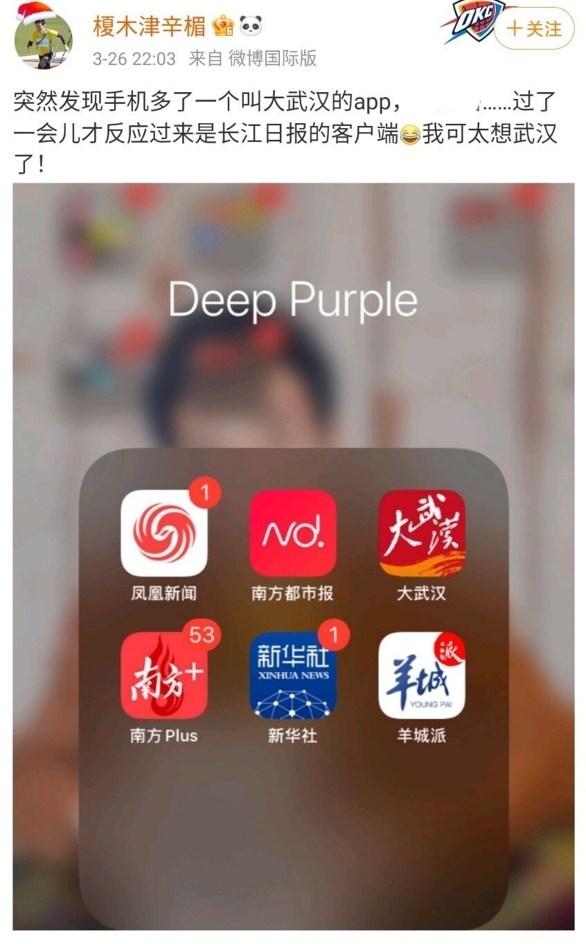 网友 @榎木津辛楣在微博上说,突然发现手机多了一个叫大武汉的APP⋯⋯过了一会儿才反应过来是长江日报的客户端,“我可太想武汉了!”