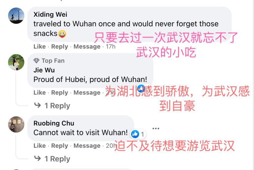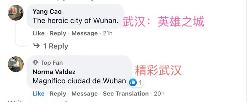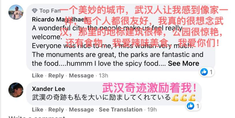 通过武汉“国际交往平台”“发现武汉”(@Discover Wuhan)脸书账号,国外网友也了解了“大武汉”客户端关于推介会的报道,来自法国、西班牙、韩国、阿根廷、泰国、巴基斯坦等国的网友,看了后深情表白:“英雄之城”“精彩武汉”“美妙的城市”。